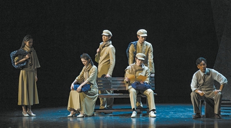 舞美設(shè)計需要構(gòu)建出復(fù)雜廣闊的時間和空間內(nèi)容范疇。多組道具營造出了多層次的視覺空間,結(jié)合話劇本身的語言邏輯共同推進(jìn)情節(jié),有回溯有瞻望。舞臺上三組沿幕側(cè)幕,以扭曲傾倒的造型和鐵銹斑斑的質(zhì)感,營造出危險動蕩的革命時代氛圍。對于影響新中國文藝發(fā)展歷程的幾部經(jīng)典作品,通過呈現(xiàn)其創(chuàng)作過程,指向漸趨明朗的人物命運。相隔數(shù)年、不同角色的命運情境得以靈動地銜接、組合,人物在時空中不斷跳進(jìn)跳出,實現(xiàn)敘述的自由。