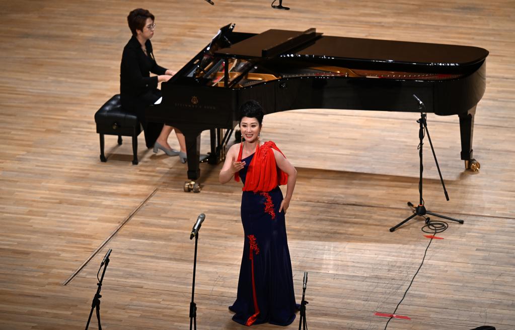 7月1日,天津歌舞劇院演員田京在演唱《萬(wàn)里春色滿家園》。新華社記者 趙子碩 攝