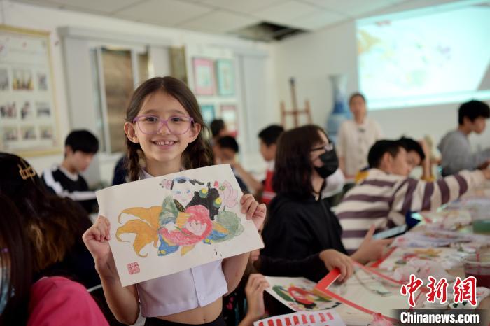 當?shù)貢r間9月10日,天津楊柳青木版年畫博物館、巴西圣保羅華僑天主堂中文學校聯(lián)合舉辦年畫傳承研習活動。圖為一位巴西小學生展示她的年畫涂色作品。中新社記者 林春茵 攝