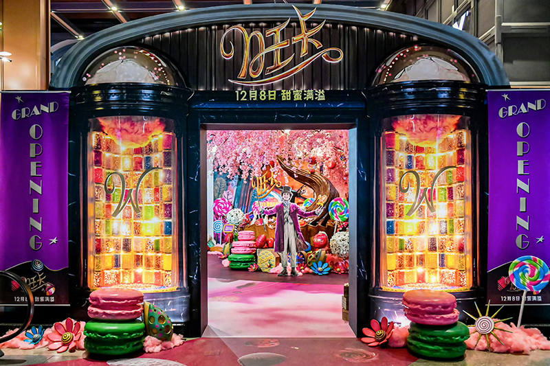 《旺卡》首映禮現(xiàn)場(chǎng)的設(shè)計(jì)獨(dú)具巧思,直接將電影中的旺卡巧克力店“搬到”影城。觀眾手持旺卡巧克力店“開(kāi)業(yè)”邀請(qǐng)函,穿過(guò)大門(mén),就步入旺卡巧克力店,正式開(kāi)啟繽紛奇趣的童話世界,令人一秒忘記所有煩惱。