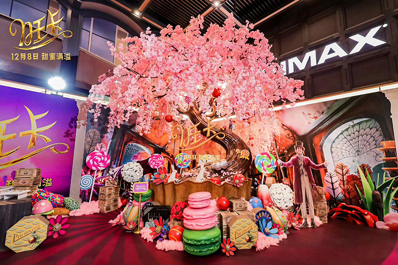 首映現(xiàn)場(chǎng),最引人注目的當(dāng)屬電影里標(biāo)志性的巧克力櫻花樹(shù)。片中,旺卡在粉色櫻花樹(shù)下漫灑巧克力糖果,夢(mèng)幻爛漫,猶如童話仙境。而在首映禮現(xiàn)場(chǎng),這棵櫻花樹(shù)也被完美復(fù)刻,櫻花樹(shù)四周堆滿各色巧克力糖果和花朵,令觀眾可以親身走入巧克力“花?!保蔀楫?dāng)天的打卡點(diǎn)。