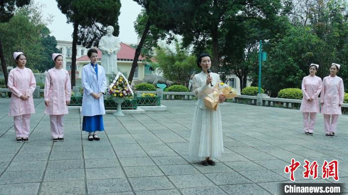 福建芳華越劇院演職員在林巧稚雕像前致敬致辭。福建芳華越劇院供圖