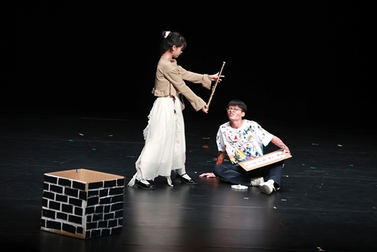 在本屆大賽的主競演單元,學生們需要圍繞首日公布的元素詞,隨機組隊,開展為期10天的限時創(chuàng)作,創(chuàng)作出20分鐘的原創(chuàng)劇目。盧昊欣第一次登上這么大的劇場,5人小組帶來一部名叫《左右》的戲。
