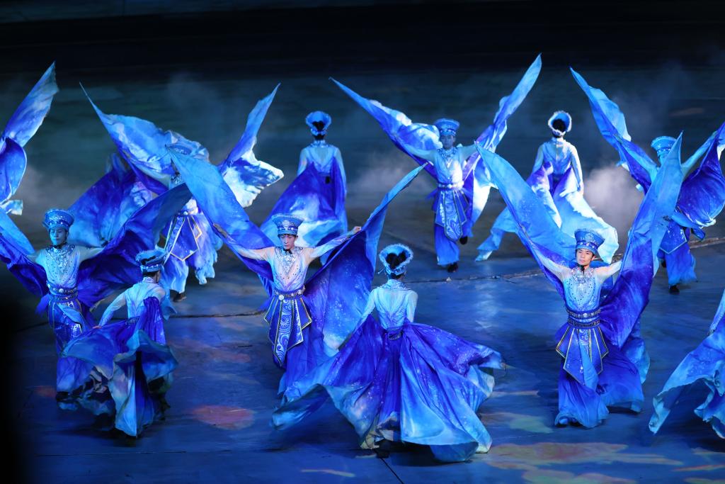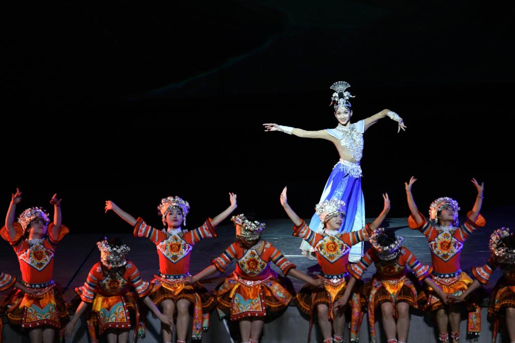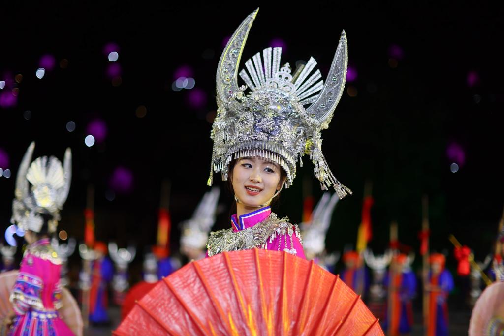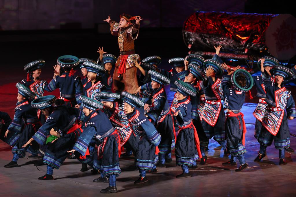 9月20日晚,演員在貴州省雷山縣大塘鎮(zhèn)表演苗族歌舞詩(shī)劇《仰歐?!?。新華社記者 楊文斌 攝