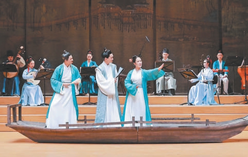 北京民族樂(lè)團(tuán)玖樂(lè)室內(nèi)樂(lè)組合擔(dān)任現(xiàn)場(chǎng)演奏,24首樂(lè)曲穿插在劇情中,訴盡人世間的離合悲歡。這些音樂(lè)作品既有傳統(tǒng)古曲,也有改編自影視音樂(lè)的當(dāng)代作品片段,與劇情故事的發(fā)展嚴(yán)絲合縫地呼應(yīng)。玖樂(lè)室內(nèi)樂(lè)組合的成員身穿宋制服裝,坐在舞臺(tái)后方,與舞臺(tái)正中央的一葉孤舟呼應(yīng),讓《人生的盛宴》的舞臺(tái)有如古畫。民樂(lè)室內(nèi)樂(lè)的現(xiàn)場(chǎng)演奏不僅僅是伴奏或添彩,更是劇目呈現(xiàn)不可或缺的一部分。