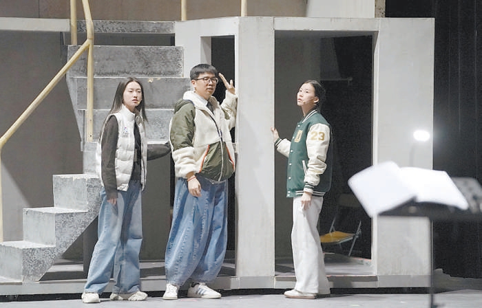 李佳軒(中)在給兩位演員說戲。北京日報記者 方非攝