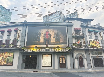 這兩天,乍浦路風(fēng)貌影視街入口處,當(dāng)年搭建“醬園”的地方又有了新變化。原先的《桃李劫》《馬路天使》的海報(bào)已撤下,掛起9米長(zhǎng)、5米寬的《醬園弄》首發(fā)巨幅海報(bào),電影拍攝時(shí)熱鬧打卡的城市記憶一時(shí)鮮活起來(lái)。勝利電影院門(mén)口的電子屏,滾動(dòng)播放著《醬園弄》幕后花絮,為影片上映做宣傳。