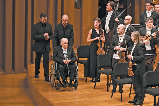 指揮大師祖賓·梅塔坐著輪椅被推上舞臺。劉方 攝