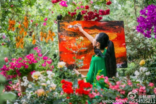 13日,舞蹈家楊麗萍在微博曬出一組自己在花園中作畫的照片。只見(jiàn)楊麗萍民族風(fēng)裝扮,而她所在的周圍鮮花滿布,姹紫嫣紅,還不時(shí)地有幾只鳥落在身旁,好似人間仙境。