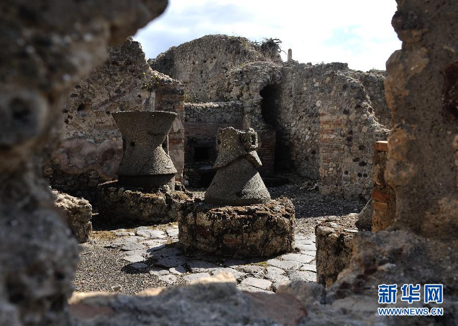 意大利龐貝古城中磨盤(pán)及面包房遺跡。新華社記者 王慶欽 攝