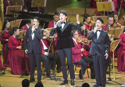 12月2日,《抒情新時代》慶祝中華人民共和國成立70周年新創(chuàng)主題歌曲音樂會在北京音樂廳上演,藝術(shù)家們演唱了18首新創(chuàng)歌曲。為了更好地完成這批主題歌曲的創(chuàng)作任務(wù),來自全國各地的近百名藝術(shù)家從西柏坡出發(fā),到延安、古田、湘江、瑞金、井岡山等地采風(fēng),并將這些體驗寫進了音樂旋律之中。圖為王凱(前中)、廖佳琳(前左)、趙越(前右)演唱《祖國正青春》。