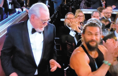 “海王”的扮演者杰森·莫瑪作為頒獎(jiǎng)嘉賓今年首次亮相金球獎(jiǎng)。此前,網(wǎng)絡(luò)上曝光了杰森為金球獎(jiǎng)“精心打扮”的視頻,視頻中杰森身著藍(lán)綠色絨面禮服,由工作人員幫忙整理裝飾;杰森則興奮地甩動自己長而卷的頭發(fā)。然而頒獎(jiǎng)典禮上,當(dāng)鏡頭拍到臺下落座的杰森時(shí),他不僅將頭發(fā)扎了起來,西服也不見蹤影,身上只穿著一件黑色背心,露出結(jié)實(shí)的肌肉。該一晃而過的鏡頭也成為今年金球獎(jiǎng)最有趣的畫面之一。