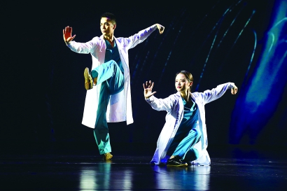 欣賞過《止戈抗疫》的觀眾有這樣的感覺:劇中的武術(shù)表演非常精彩,讓人耳目一新。比如一身白衣的醫(yī)護(hù)人員與一身黑衣的“新冠病毒”之間的拳法較量,有貼身肉搏,也有不接觸身體的打斗,醫(yī)護(hù)人員舍己為人的英勇形象非常飽滿。不僅是各路拳法,各種器械表演在劇中均有展現(xiàn),導(dǎo)演組根據(jù)不同職業(yè)的特點(diǎn),為舞臺上各色人物設(shè)計(jì)妥帖的武術(shù)語言?!皠∏槔镂铇屌獎Σ惶侠?,所以就把器械融合在職業(yè)特點(diǎn)中。比如建筑工人用棍子來傳遞他背后的力量;快遞員的包裹設(shè)計(jì)成盾牌,表達(dá)風(fēng)雨無阻的概念……”鄭思文解釋,運(yùn)用武術(shù)獨(dú)有的肢體語言,以拳法、器械的技術(shù)動作為載體,將武術(shù)的專業(yè)技能與舞臺藝術(shù)的表現(xiàn)形式融合起來。