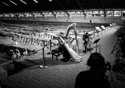 牛背梁最近陰雨連連,樂(lè)團(tuán)必須帶上雨布和雨衣;華山陡峭,得用纜車(chē)運(yùn)送樂(lè)器,山頂大風(fēng)吹得樂(lè)譜亂飛,平時(shí)在戶(hù)外固定譜子的磁條抵擋不住,只能改成橡皮筋這種“土方法”;在秦始皇陵和其他博物館里演出,燈光必須調(diào)試到國(guó)家規(guī)定的范圍內(nèi),聲音也不能超過(guò)游客最多時(shí)的嘈雜程度,選用的樂(lè)器都是柔和的弦樂(lè)和木管……