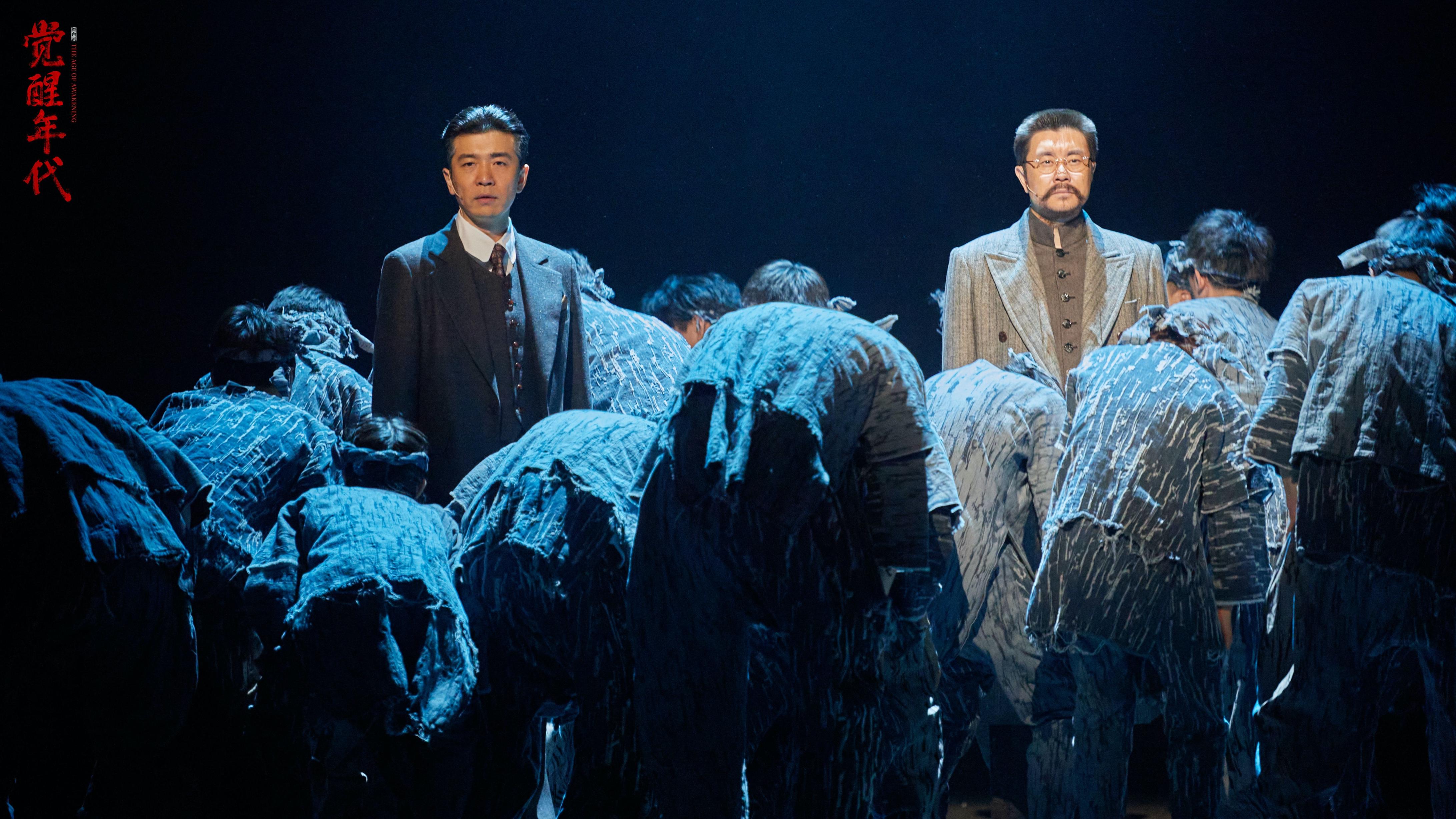 黑暗之中,地面之上,星火閃爍,“覺醒年代”四個(gè)大字醒目地投射在銹跡斑駁的鐵板上,兩面7.5米高的全機(jī)械數(shù)控轉(zhuǎn)臺(tái)緩緩展開,朦朧的煙霧環(huán)繞四周,一眾青年演員用極具張力的肢體語(yǔ)言透露著20世紀(jì)初陷入迷茫的中國(guó)現(xiàn)狀。李大釗、陳獨(dú)秀兩位革命先輩在憤怒與悲愴中登場(chǎng),民族生死關(guān)頭,國(guó)家存亡之際,他們點(diǎn)燃了一群仁人志士的熱血與希望……