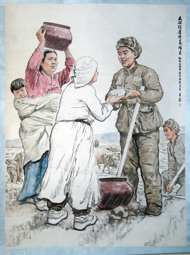 蔣兆和畫(huà)作《友誼深厚情義難忘》 ??在展廳里,有一幅蔣兆和創(chuàng)作的中國(guó)畫(huà)《友誼深厚情義難忘》,畫(huà)中的“紀(jì)念志愿軍抗美援朝十周年”題跋道出了其創(chuàng)作的時(shí)間。畫(huà)面的主體是兩位朝鮮婦女正為志愿軍戰(zhàn)士送水,其中一位婦女還背著可愛(ài)的幼兒。在幾位主要人物的身后,畫(huà)家細(xì)致地描繪了志愿軍戰(zhàn)士們?cè)谵r(nóng)田幫助朝鮮人民恢復(fù)農(nóng)業(yè)生產(chǎn)的場(chǎng)景。在中朝軍隊(duì)打退以美國(guó)為首的“聯(lián)合國(guó)軍”、朝鮮停戰(zhàn)協(xié)定簽訂后,志愿軍在鞏固防守的同時(shí),還幫助朝鮮人民建設(shè)新家園,與朝鮮人民結(jié)下了深厚情誼。