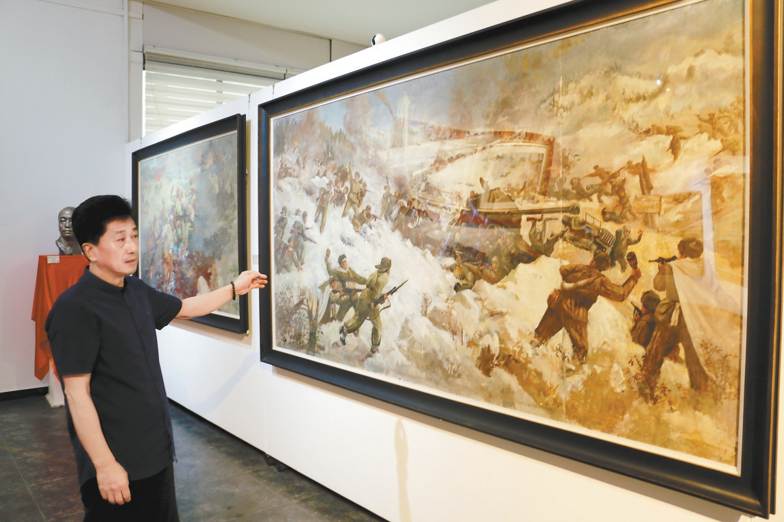 在798藝術(shù)區(qū)內(nèi),坐落著朝鮮萬(wàn)壽臺(tái)創(chuàng)作社美術(shù)館,它是由朝鮮政府投資成立的唯一海外美術(shù)館,亦是中朝文化交流的重要紐帶。美術(shù)館二樓的紀(jì)念抗美援朝作品展區(qū),珍藏著蔣兆和、伍必端、戴澤等中國(guó)藝術(shù)家創(chuàng)作于上世紀(jì)五六十年代的經(jīng)典作品,不僅用藝術(shù)的語(yǔ)言銘刻下抗美援朝戰(zhàn)場(chǎng)上的感人故事,而且見(jiàn)證了在血與火中鑄就的中朝友誼。 ??“1951年,畫(huà)家伍必端以戰(zhàn)地記者身份到朝鮮前線(xiàn)采訪(fǎng),創(chuàng)作多幅戰(zhàn)地速寫(xiě),這幅作品是他創(chuàng)作的油畫(huà)《中朝部隊(duì)并肩作戰(zhàn)打擊美國(guó)狼》?!背r萬(wàn)壽臺(tái)創(chuàng)作社美術(shù)館館長(zhǎng)吉正太介紹,這幅畫(huà)表現(xiàn)的是上甘嶺戰(zhàn)役中激烈的戰(zhàn)斗場(chǎng)景,冬日的戰(zhàn)場(chǎng)上覆蓋著白雪,空中硝煙彌漫,中國(guó)人民志愿軍和朝鮮人民軍的戰(zhàn)士們正抗擊侵略者,有的在扔手榴彈,有的在沖鋒,還有的與侵略者近身搏斗……身處前線(xiàn)的伍必端用畫(huà)筆記錄下最可愛(ài)的人,展現(xiàn)出一位人民藝術(shù)家對(duì)革命事業(yè)的一腔赤誠(chéng)。