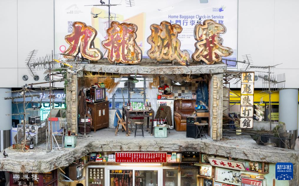 新華社香港10月7日電 香港國際機(jī)場接機(jī)大廳,一座約6.5米高的雙層舊建筑物屋頂亮著“九龍城寨”霓虹燈牌,吸引許多旅客駐足欣賞。7日,以“走進(jìn)香港 走進(jìn)香港電影”為主題的展覽在香港國際機(jī)場舉行開幕儀式,電影《九龍城寨之圍城》多個拍攝場景一一重現(xiàn)。