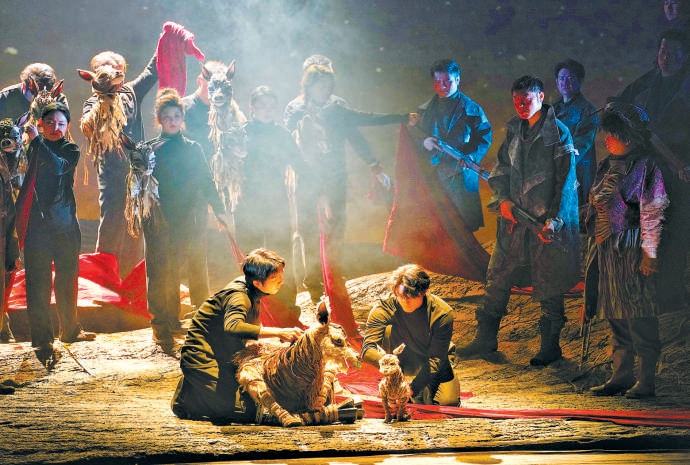 在舞臺呈現(xiàn)上,舞美設(shè)計常煒以“山的血脈”為核心意象,山體內(nèi)部的紋理宛若血液流動,山石土地俱在跳動、呼吸。整體來說,《可可西里》的舞臺置景變化并不劇烈,燈光、景片以及經(jīng)幡等裝飾以恰到好處的力度表明時間地點的轉(zhuǎn)換,暗喻劇情和人物內(nèi)心的走向——在有些舞臺作品選擇以噱頭和炫技招攬觀眾的當下,《可可西里》流淌著一種久違的、質(zhì)樸的暖意,主創(chuàng)團隊為這部作品付出了足夠的誠意,比如,無論是電影《可可西里》,還是人們對這片凈土的既有認知,動物都在其中扮演重要的角色,但毫無疑問,要在舞臺上把動物塑造得真實且有藝術(shù)表現(xiàn)力,并不容易。主創(chuàng)團隊沒有偷工減料地繞過這個難題,而是以模仿動物習性的“偶”代替,當從“母羊”的腹中剖開一卷鮮紅的長綢,“小羊”跌跌撞撞地學著起身時,溫柔灑落的天光配合層層遞進的音樂,把現(xiàn)場氣氛推向一次動人的高潮。