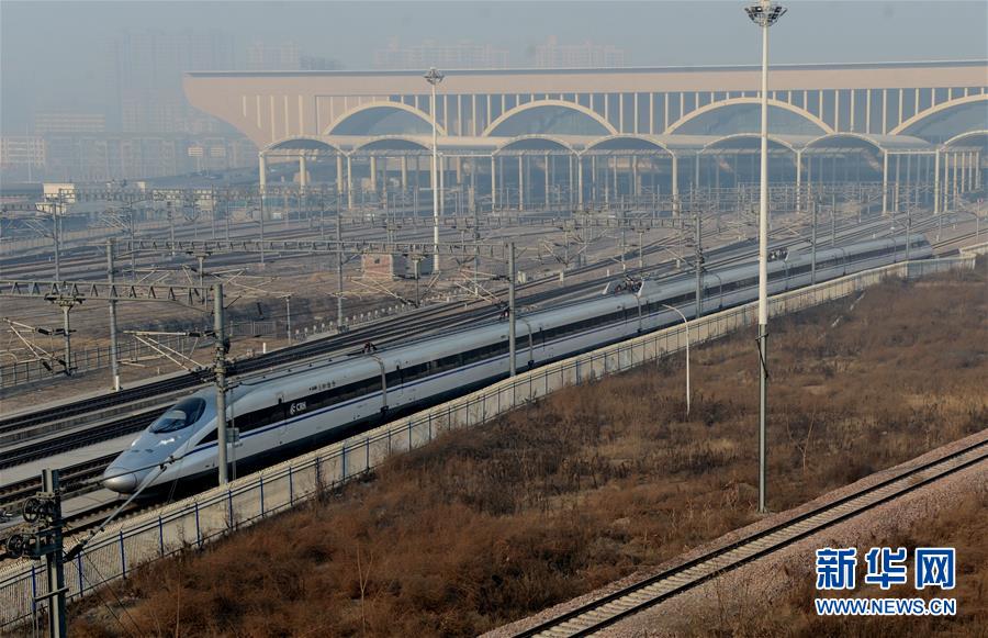 一輛動車組列車駛離石家莊火車站(1月9日攝)。 1月10日零時起,全國鐵路實行新的列車運(yùn)行圖,增開旅客列車285.5對,其中增開動車組列車281.5對。運(yùn)行圖調(diào)整后,全國鐵路開行旅客列車總數(shù)達(dá)到3142對,其中動車組列車1980.5對。新華社記者 牟宇 攝