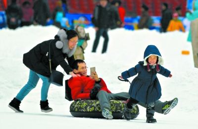 鳥巢主場(chǎng)北側(cè)的歡樂戲雪區(qū)是一片無拘無束的雪海:拉上雪圈繩就能孩子載著爸媽、爸媽載著孩子在雪圈廣場(chǎng)恣意撒歡兒。(記者左穎)