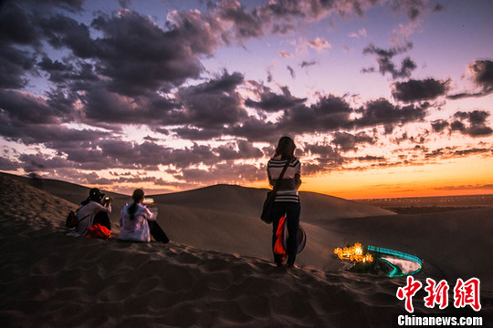 7月中旬,國際旅游名城甘肅敦煌進入旅游旺季,每天成千上萬的海內(nèi)外游客來到當(dāng)?shù)刂Q沙山月牙泉景區(qū)觀光游覽,觀賞大漠風(fēng)光,感受敦煌文化,體驗民俗風(fēng)情。傍晚時分,西邊的天空被晚霞染紅,美麗的月牙泉被寶藍(lán)色的燈光點綴著呈現(xiàn)出美輪美奐的闌珊夜色,大批游人沉浸于如夢如幻的迷人夜色里流連忘返。