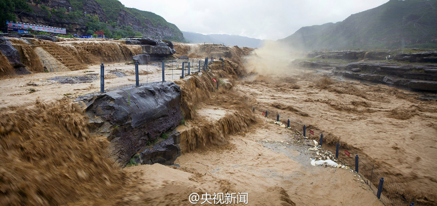 受上游強(qiáng)降雨和水庫放水影響,最近幾天,黃河壺口瀑布迎來伏汛,最大水流量達(dá)到每秒2600立方米左右,濁流滾滾奔騰而下,氣勢磅礴!(央視記者李志 文豪)