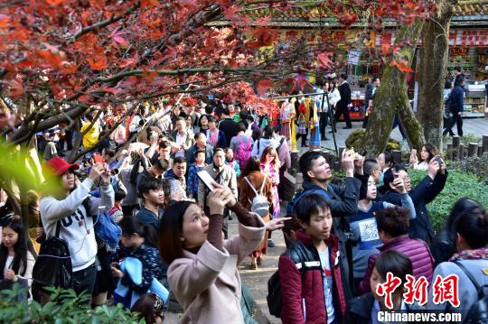 11月26日,長沙岳麓山上迎來眾多游客扎堆賞楓。岳麓山是全國四大賞楓勝地之一,每年的11月下旬至12月為最佳觀賞期,登山可看到“漫山紅遍,層林盡染”的美景。