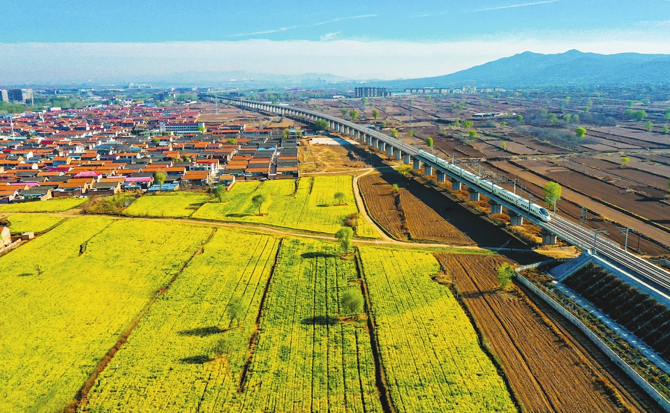 4月9日,長(zhǎng)治市潞州區(qū)南垂村,金燦燦的油菜花海與村落、高鐵列車(chē)交織成一幅鄉(xiāng)村振興的田園畫(huà)卷,美不勝收。張海 張永清攝