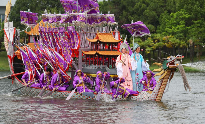 新華社上海6月10日電(記者陳愛平、許曉青)隨著立竿、出龍、點睛、接龍、送標(biāo)、旺盆等儀式完成,68歲的張亭源老人身著金黃色底、繡有青龍圖案的衣裳,健步登上五彩龍船。平底、昂首、翹尾的龍船在上海寶山美蘭湖面靈活行駛、快速轉(zhuǎn)彎,隊員們齊聲呼號,戲曲演員立于船頭,彩旗在風(fēng)中飄揚,引得現(xiàn)場觀眾連連叫好。