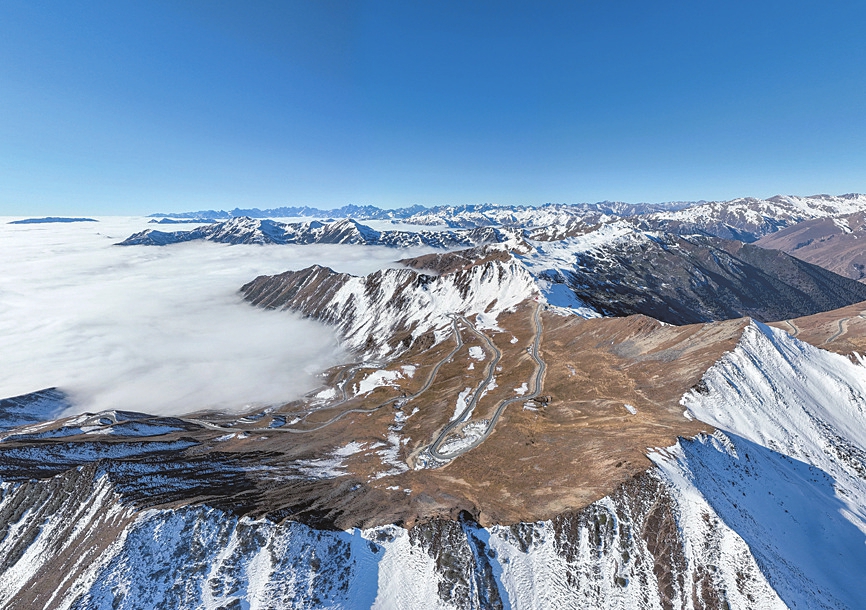 圖為12月25日拍攝的四川夾金山云海(無人機照片)。冬日的四川夾金山,云海翻騰。從高空俯瞰,連綿起伏的群山被云?;\罩,呈現(xiàn)出壯美的自然風(fēng)光。