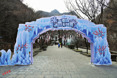 五老峰景區(qū)錦繡谷,工作人員借助天然溪流形成的冰掛加以人工造冰造型,按照生態(tài)環(huán)保和藝術(shù)創(chuàng)意要求,打造出長約1公里、單體高3米至10米的彩色冰掛,極具視覺沖擊力。一條條冰掛或垂于崖壁,或懸于樹枝,晶瑩剔透,壯觀雄渾。滿目的玉樹瓊花、銀峰玉柱形成一幅霧凇冰掛奇景,讓人仿佛置身于童話世界。