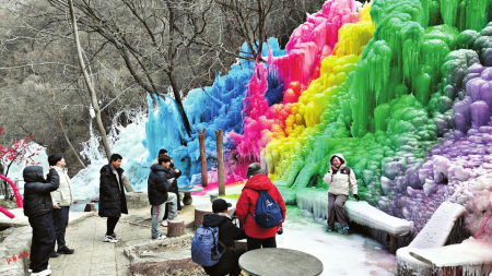 4.游客在五老峰錦繡谷彩色冰掛前游玩。
