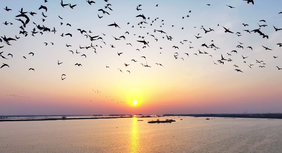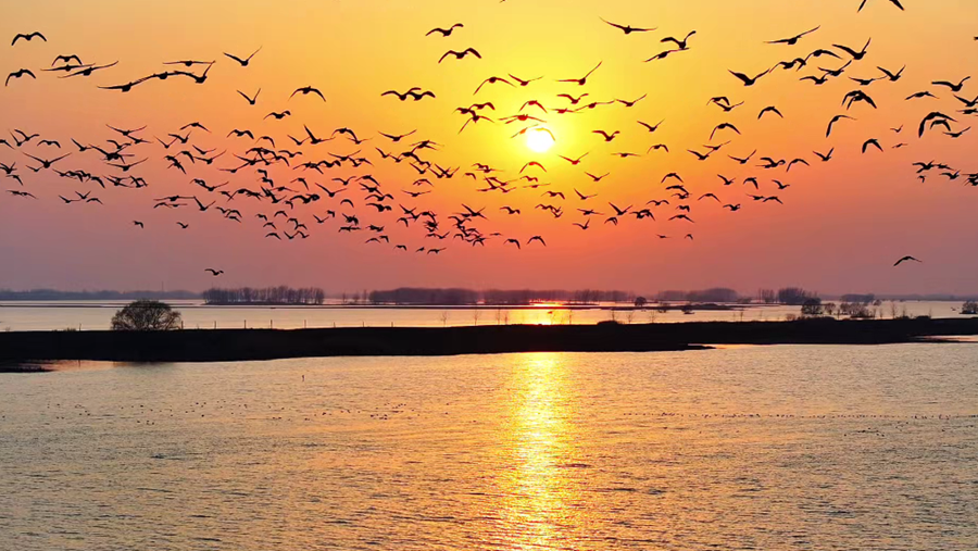 ?初春時(shí)分,在夕陽(yáng)余暉映照下,安徽省潁上縣秋家湖濕地被染上一層夢(mèng)幻般的色彩。放眼望去,成群飛鳥與漫天霞光融為一體,繪就出一幅壯美而靈動(dòng)的生態(tài)畫卷。(徐紅梅)