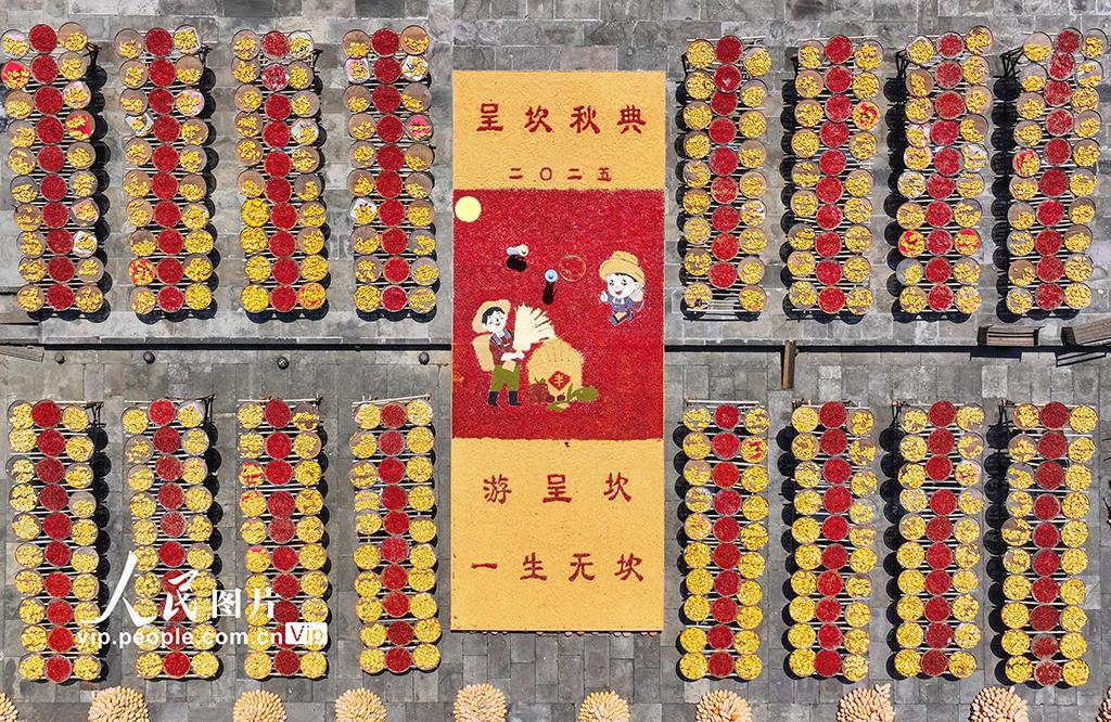 2025年8月18日,安徽省黃山市徽州區(qū)呈坎古村迎來了一年一度的“曬秋”盛景,村民們趁著晴好天氣,將豐收歸倉的玉米、南瓜、紅辣椒等農(nóng)作物鋪滿曬場,五彩斑斕的農(nóng)作物與徽派古建交相輝映,構(gòu)成一幅五谷豐登的秋收畫卷,吸引眾多游客前來感受豐收的喜悅。施亞磊攝(人民圖片網(wǎng))