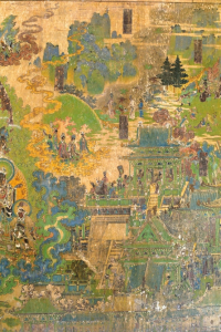 但巖山寺金代壁畫有確切年代,是御前承應(yīng)畫匠王逵用10年時(shí)間才完成這一煌煌巨制。800多年前,王逵面對(duì)四壁,決然舍棄慣常的連環(huán)畫形式,大膽?yīng)殑?chuàng),采用滿幅構(gòu)圖形式,以一組繁雜的宮廷建筑為中心,配以各種故事情節(jié)畫面,然后用山水、樹石、云嵐連結(jié),細(xì)部真實(shí),透視準(zhǔn)確,遠(yuǎn)看儼然一幅氣勢(shì)磅礴的大型山水畫,近瞧卻又章回分明。壁畫上就有多處使用瀝粉堆金裝飾,顯現(xiàn)金碧輝煌、富麗非凡的效果。這樣大面積的工筆重彩畫,一絲不茍,找不到起稿與粉本痕跡,而且線條變化多樣,無一廢筆,令人驚嘆。