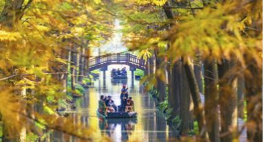 初冬時(shí)節(jié),江蘇興化里下河國(guó)家濕地公園層林盡染、色彩斑斕,如畫(huà)美景吸引不少游客前來(lái)游玩。周社根攝(人民圖片網(wǎng))