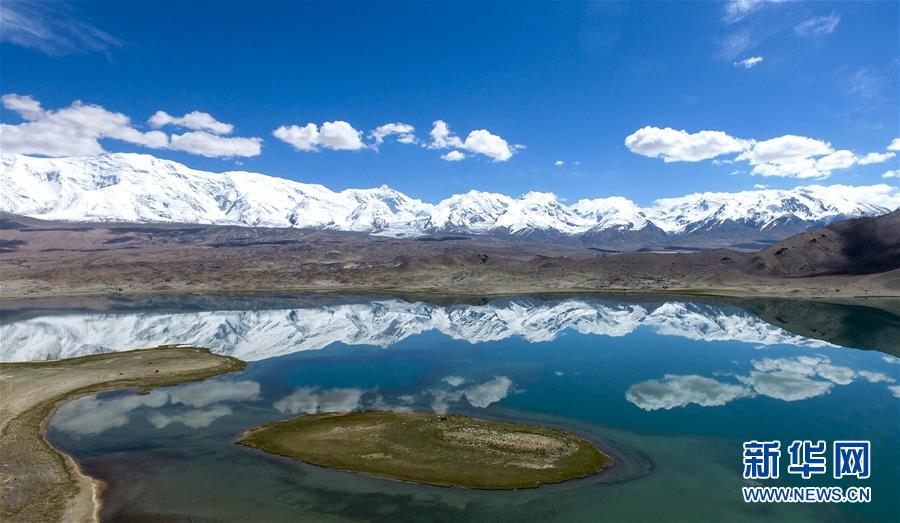 公格爾九別峰倒映在卡拉庫里湖里(6月7日攝)。6月的帕米爾高原風光旖旎,吸引國內(nèi)外大量游客前來領略它的神韻。 新華社記者趙戈 攝