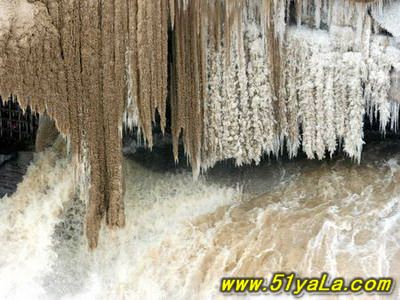 由于四季氣候和水量的差異,壺口景色也時(shí)有所變。壺口的春秋兩季,景象也甚為奇特,有氣為虹,橫浮水上,形成了“岸旁無(wú)虹掛長(zhǎng)雨”的景觀。春回大地的時(shí)候,漫山遍野的山桃花盛開(kāi),黃河冰岸消融,水量適度平穩(wěn),主瀑、副瀑連成一片,看主瀑云霧迷蒙,望副瀑萬(wàn)壑千流,觀“龍槽”如巨龍掀浪,稱為“三月桃花汛”;秋季9-11月份雨季剛過(guò)去時(shí),河邊眾多山泉小溪,匯集大量清流,陣陣秋風(fēng)吹過(guò),常有彩虹出現(xiàn),叫做“壺口秋風(fēng)”。明陳維藩《壺口秋風(fēng)》詩(shī)有“秋風(fēng)卷起千層浪,晚日迎來(lái)萬(wàn)丈紅”句,可謂真實(shí)寫(xiě)照。這兩個(gè)時(shí)期,水大而穩(wěn),瀑布寬度可達(dá)千米左右。主瀑難以接近,但遠(yuǎn)遠(yuǎn)望去,煙波浩淼,威武雄壯。大浪卷著水泡,奔騰咆哮,以翻江倒海之勢(shì),飛流而下。壺口的冬日,又是一種奇觀:壺口兩側(cè),冰簾垂掛,晶瑩剔透,格外誘人,農(nóng)歷小雪,大雪前后,上游漂流下來(lái)的大冰塊,落入壺口平緩處,冰塊相交,冰峰凍結(jié),冰橋天然合成,人履冰橋,如走坦途,人們稱為“壺口叉橋”。在天橋村附近,積冰成橋,冰橋下激流滾滾,濤聲大作,人們稱之為“天橋”。