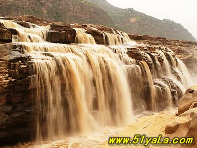 壺口瀑布位于吉縣城西45公里、距臨汾市165公里處的晉陜峽谷黃河河床中,為世界上最大的黃色瀑布,因其氣勢(shì)雄渾而享譽(yù)中外。此地兩岸夾山,河底石巖上沖刷成一巨溝,寬達(dá)30米,深約50米,滾滾黃水奔流至此,倒懸傾注,若奔馬直入河溝,波浪翻滾,驚濤怒吼,震聲數(shù)里可聞。其形如巨壺沸騰,故名。黃河浪濤激起一團(tuán)團(tuán)霧煙云隨著水霧的升高,煙云由黃變灰、由灰變藍(lán),景色奇麗,有“水底生煙”之說(shuō)。壺口瀑布不僅有“水底冒煙”,“彩橋通天”奇景,更有“旱地行船”之說(shuō)。上游船只到此,必須離水登陸,經(jīng)人抬或車(chē)運(yùn)繞過(guò)壺口(即所謂“旱地行船”)方可入水續(xù)航,千百年來(lái),概莫能變。