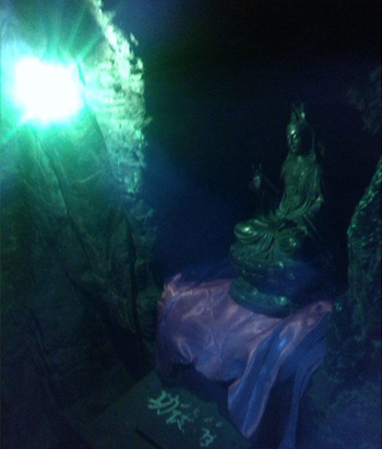 千佛洞,分內(nèi)外兩洞,外洞大而明,內(nèi)洞小而幽,中間有一個扁圓形孔穴相通。內(nèi)洞中,可以容納五至七人。內(nèi)洞的洞壁上,山巖經(jīng)水溶化,產(chǎn)生許多乳石及石筍,夾有各種色質,猶如人體心肝五臟,洞形又呈葫蘆形狀,后人便稱之為母腹。佛教宣揚進入小洞就是投胎佛母,受其恩育,復出小洞就是洗掉人生一切煩惱,獲得無上歡樂幸福。