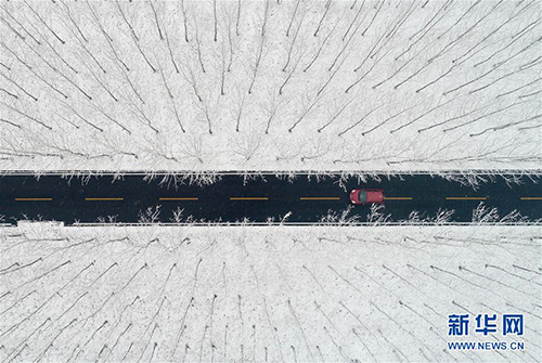 12月11日,一輛汽車在山東省棗莊市臺兒莊區(qū)濤溝河濕地的道路上行進(jìn)。 當(dāng)日,受低溫天氣影響,山東省棗莊市迎來降雪。 新華社發(fā)(高啟民 攝)