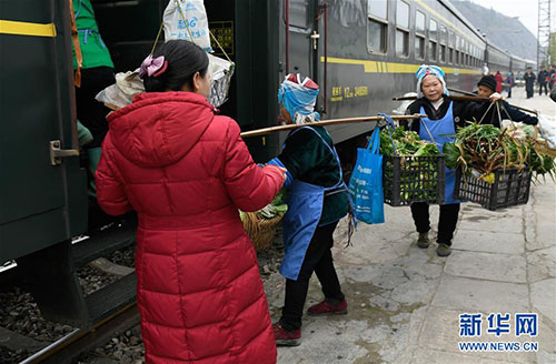 1月27日,乘客挑著擔(dān)子登上5639次列車。 由貴州玉屏開往貴陽的5639次列車是輛綠皮“慢火車”。沿途群眾每天挑著籮筐上車,將自家出產(chǎn)的農(nóng)作物帶到貴陽、凱里等地販賣,再坐著火車把生產(chǎn)資料和日用品帶回家。時(shí)間一長,不少乘客直接在列車上買賣貨物。春節(jié)將至,蔬菜水果等農(nóng)產(chǎn)品交易較往日更加紅火,列車上的“年貨市場”洋溢著濃濃年味。 新華社發(fā)(許毅 攝)
