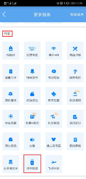 2.進(jìn)入【行前】界面,點(diǎn)擊【行李托運(yùn)】