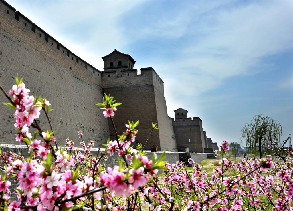 平遙古城墻與桃花相互映襯。(圖片由平遙古城景區(qū)提供)