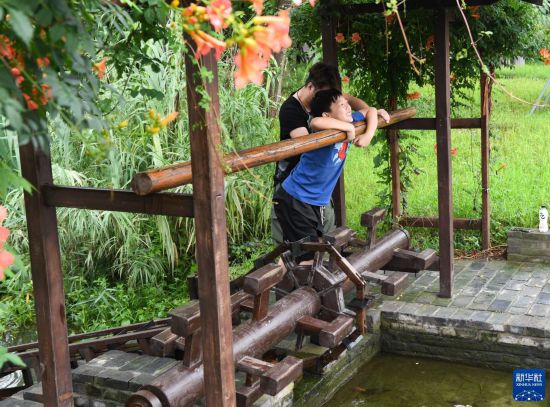 7月11日,游人在穆溝古村體驗踩水車。