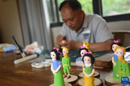 7月11日,江蘇省級非物質(zhì)文化遺產(chǎn)“阜寧面塑”傳承人周必良在穆溝古村進(jìn)行創(chuàng)作。