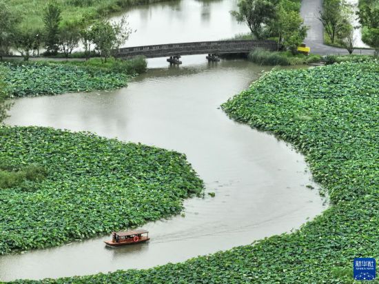 7月11日,游人乘船游覽穆溝古村(無人機照片)。