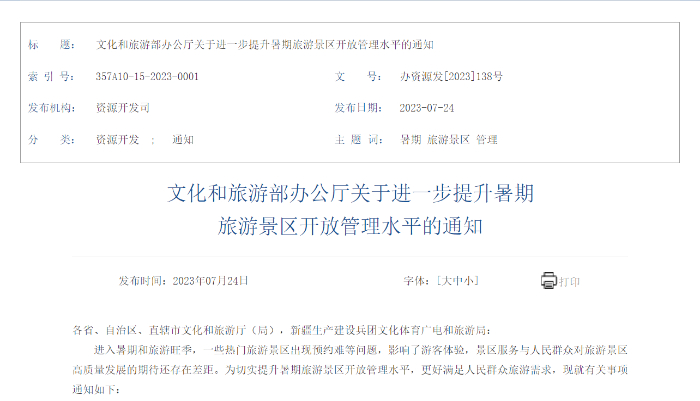 ??通知中稱,進(jìn)入暑期和旅游旺季,一些熱門旅游景區(qū)出現(xiàn)預(yù)約難等問題,影響了游客體驗,景區(qū)服務(wù)與人民群眾對旅游景區(qū)高質(zhì)量發(fā)展的期待還存在差距。為切實提升暑期旅游景區(qū)開放管理水平,更好滿足人民群眾旅游需求,現(xiàn)就有關(guān)事項通知如下: