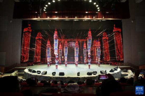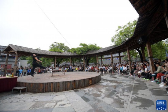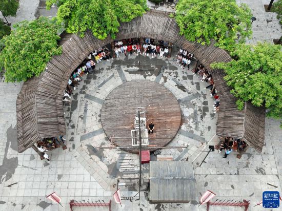 8月12日,在河北省滄州市吳橋雜技大世界景區(qū)江湖文化城,游客們觀看雜技藝人表演傳統(tǒng)雜技節(jié)目(無人機(jī)照片)。